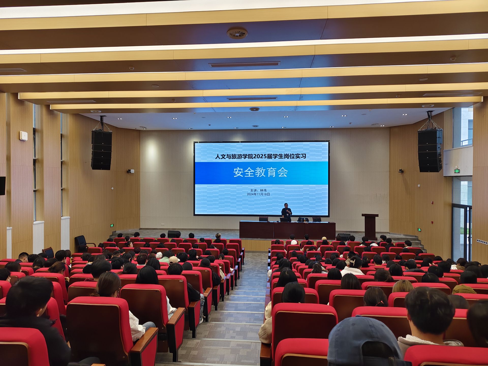 为进一步加强对实习学生的指导力度,确保2025届学生做好必要的实习准备,人文与旅游学院于11月18日在厚德楼及崇信楼报告厅,分4批次开展2025届学生岗位实习动员暨安全教育专题培训。2025届936名即将步入实习阶段的学生积极参与。培训期间,人文与旅游学院院长林伟、教学副院长曹芳,分别就实习安全教育、实习具体安排等进行讲解。