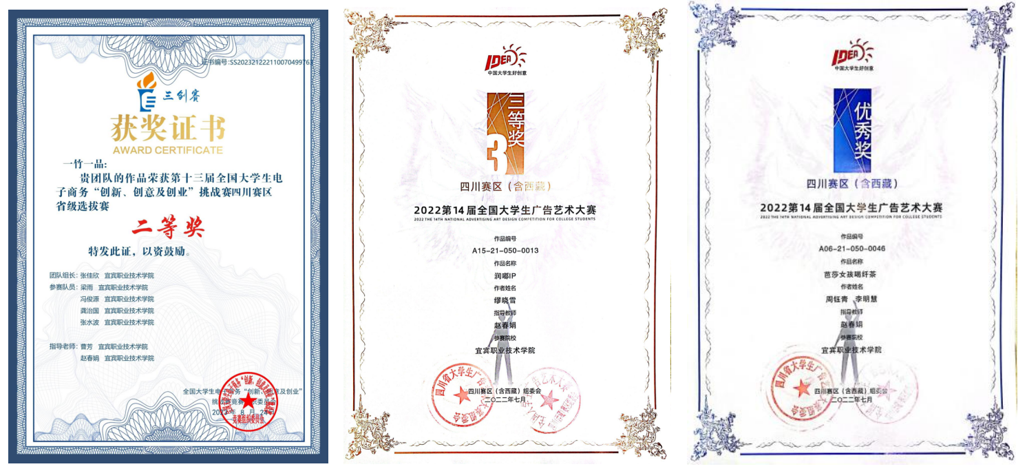 课程通过“以赛促教”的方式,激发学生的学习积极性和创新能力。学生们在各类技能竞赛中屡获佳绩,累计获奖达12项,其中包括2022年“建行杯”第八届四川省国际“互联网+”四川省赛铜奖、2022年第14届全国大学生广告艺术大赛四川赛区三等奖等。这些竞赛不仅提升了学生的专业技能,也增强了他们的团队合作和创新能力。