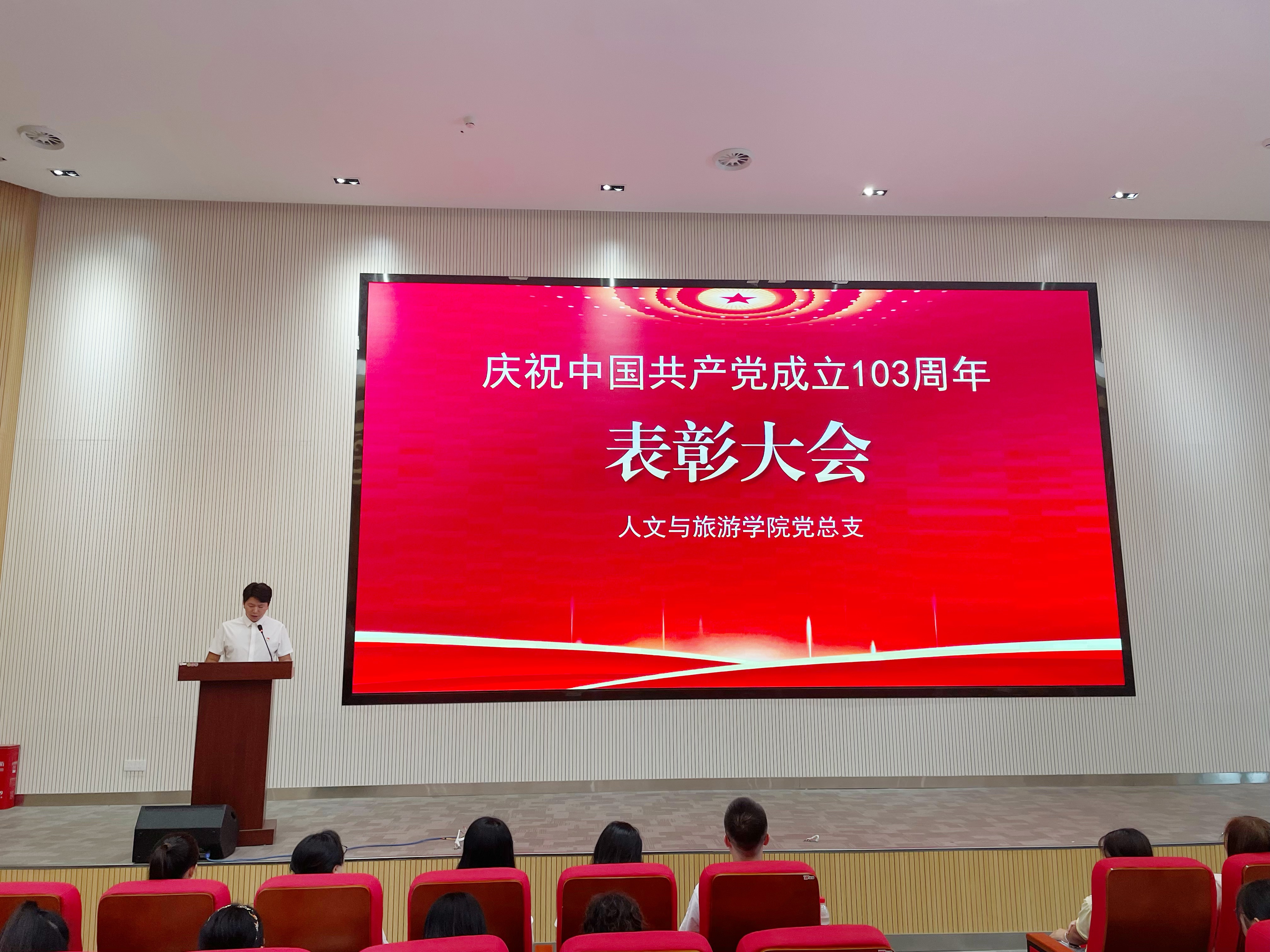 7月1日下午,人文与旅游学院庆祝中国共产党成立103周年表彰大会在崇信楼117隆重举行。党总支书记李璟、受表彰的优秀党员和优秀党务工作者,全体党员、预备党员等参加活动,活动由党总支副书记杨维达主持。