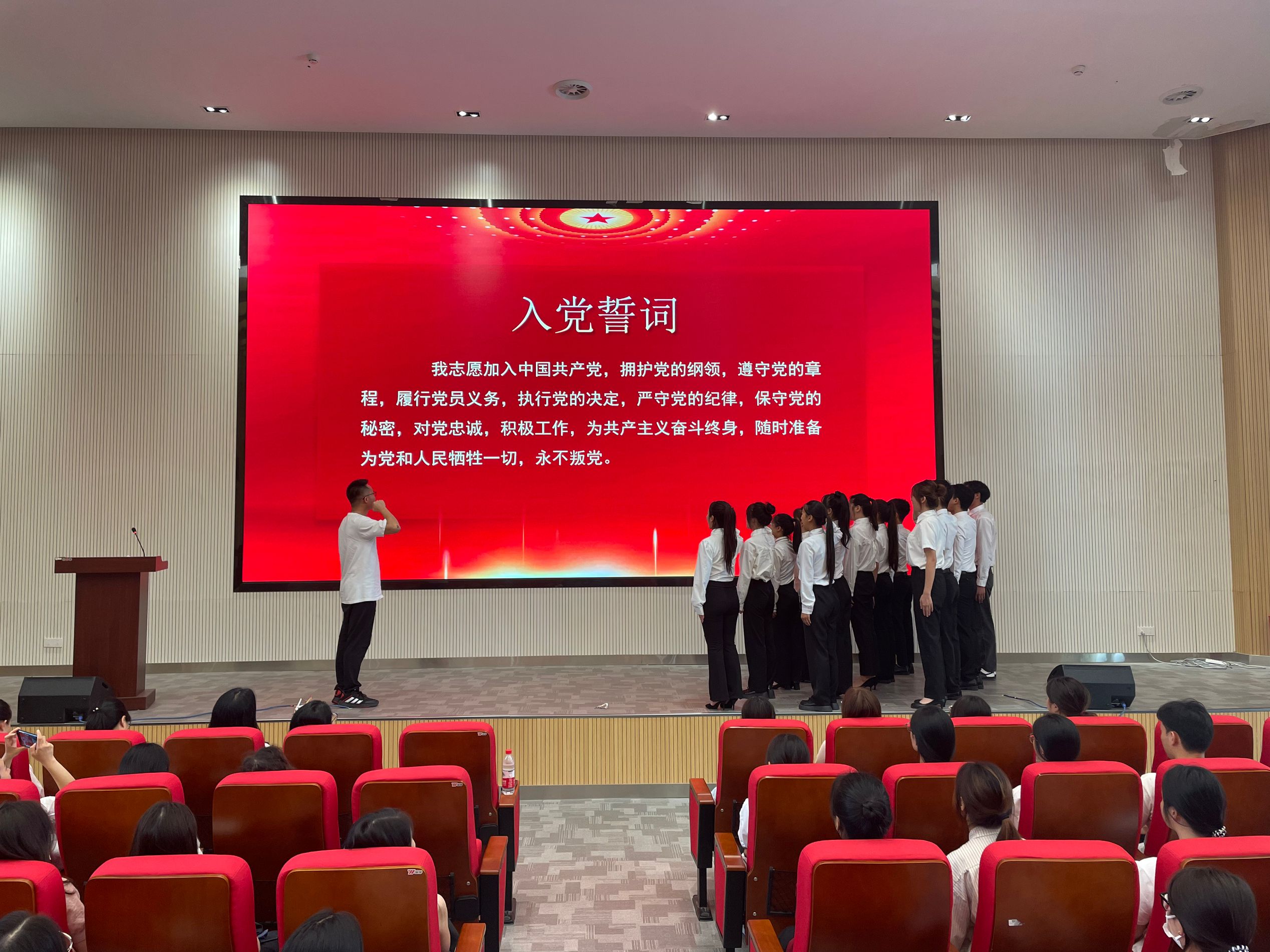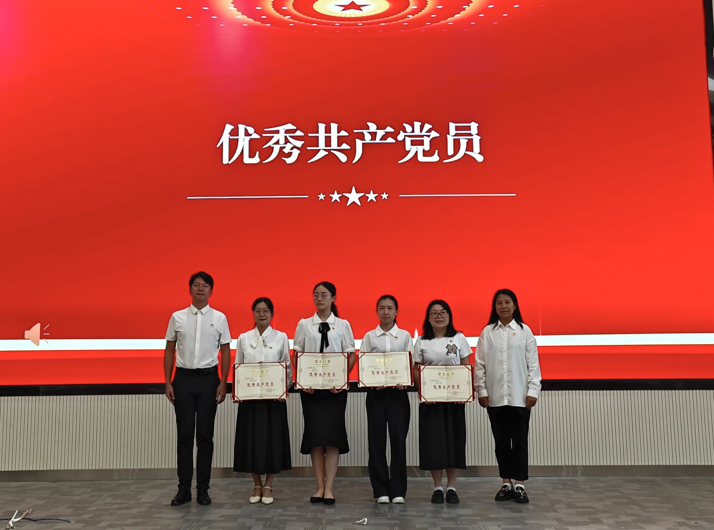 庆祝活动在庄严的国歌声中开始,全体党员怀着激动的心情齐声高唱国歌。与会领导分别为优秀党务工作者石朋,优秀党员文睿晰、赵春娟、肖乾丽、徐艺裴颁发荣誉证书。学生新党员进行了入党宣誓,全体党员也一起重温了入党誓词。预备党员代表高诗雨同学、优秀党员代表文睿晰老师先后上台发言,分享心得感悟。