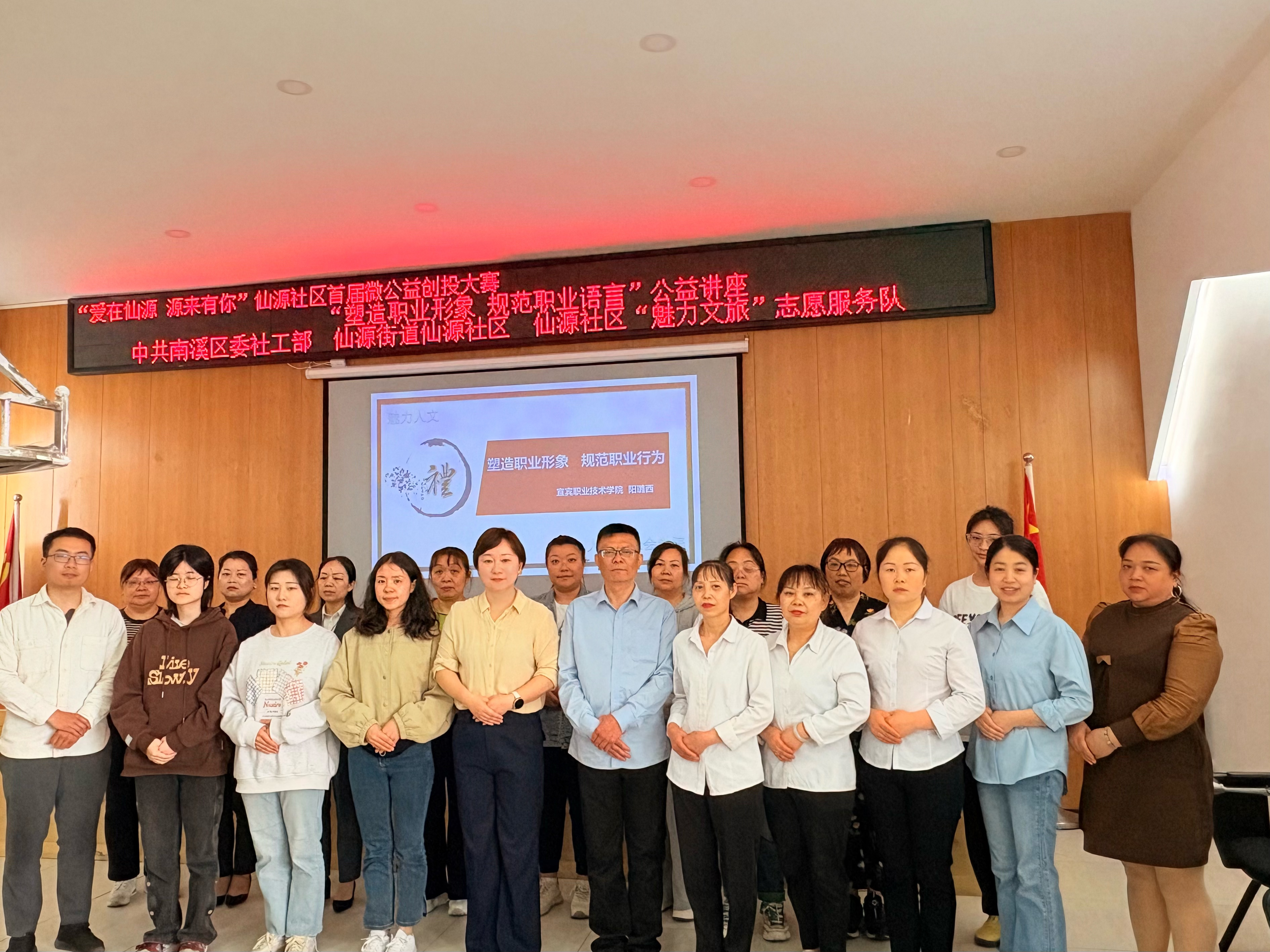 2025年4月11下午“塑造职业形象 规范职业语言”主题培训在仙源社区二楼公共空间开展,仙源社区工作人员、社区网格员等约二十余人参加了活动。此次培训着重从社区工作人员的岗位职责、岗位形象要求入手,对标职业的仪容仪表仪态,语言行为规范,结合会议组织管理的实训实操项目,采用角色扮演、情景模拟的手段,将工作场景与礼仪知识结合开展教学。活动现场,气氛活跃,积极互动,授课老师用生动形象的语言倡导社区工作人员爱岗敬业,服务辖区居民。