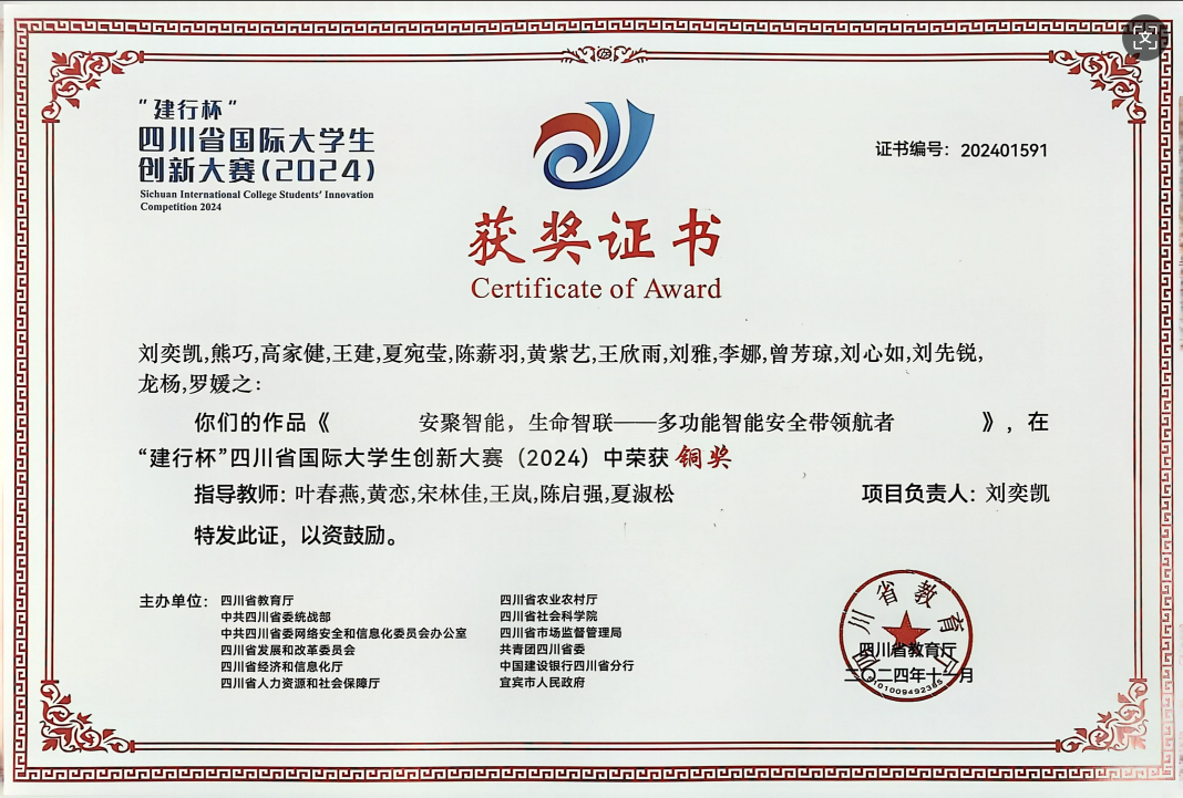 2024年11月,由四川省教育厅主办的“建行杯”四川省国际大学生创新大赛(2024)圆满收官。我院人力资源管理专业教师团队指导的学生团队项目《安聚智能,生命智联——多功能智能安全带领航者》,凭借其创新设计与实践价值,在职教赛道创意组中荣获“铜奖”,展现了我院师生在数智赋能领域的探索成果。