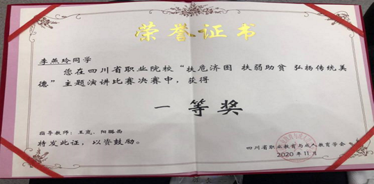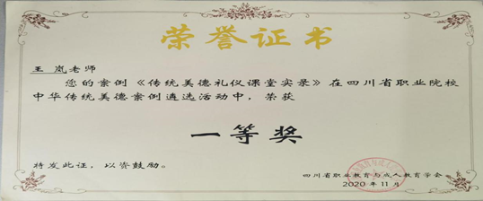2020年11月30日,四川省职业院校第三届“奋进新时代 中华传统美德天府职教行”活动周在四川交通职业技术学院举行。 本次活动中,我院师生荣获多个奖项。我院教师王岚申报的《传统美德礼仪课堂实录》荣获四川省职业院校中华传统美德案例一等奖。在“扶危济困 扶弱助贫 弘扬传统美德”主题演讲比赛中,我院文秘11802班李燕玲获得学生组一等奖。 本次活动,旨在职业院校深入开展“弘扬时代精神,彰显道德力量”主题活动,大力弘扬抗疫精神,脱贫攻坚精神及社会主义核心价值观,培育民族精神和时代精神。通过参加本次活动,加深了全体职校教师们对弘扬传统美德的理解,增强了全体职教人的使命感和责任感。