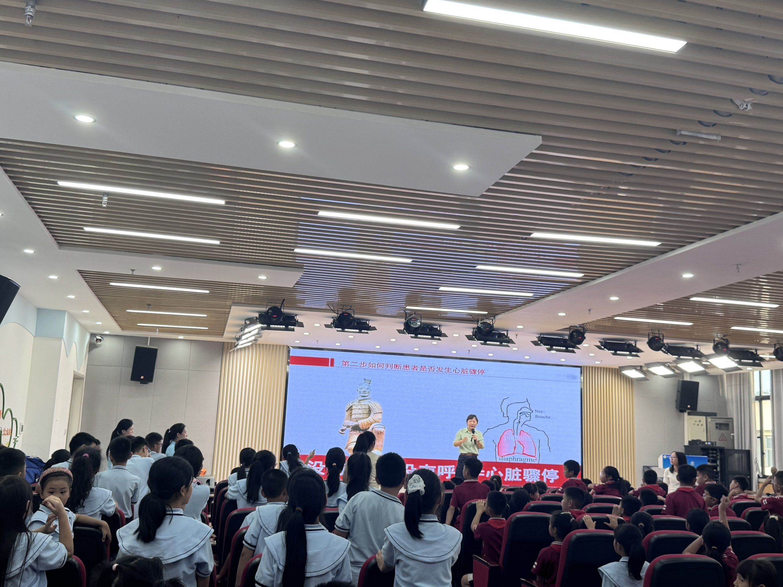 与此同时,学校的学术会议厅内,阳璐西老师的儿童应急救护课程正以“情景模拟+实操演练”的形式展开。“当看到有人晕倒,我们首先要判断现场环境是否安全……”阳老师通过PPT图文并茂地讲解了急救原则、拨打急救电话的规范流程,并重点演示了“海姆立克急救法”“心肺复苏”等实用技能。