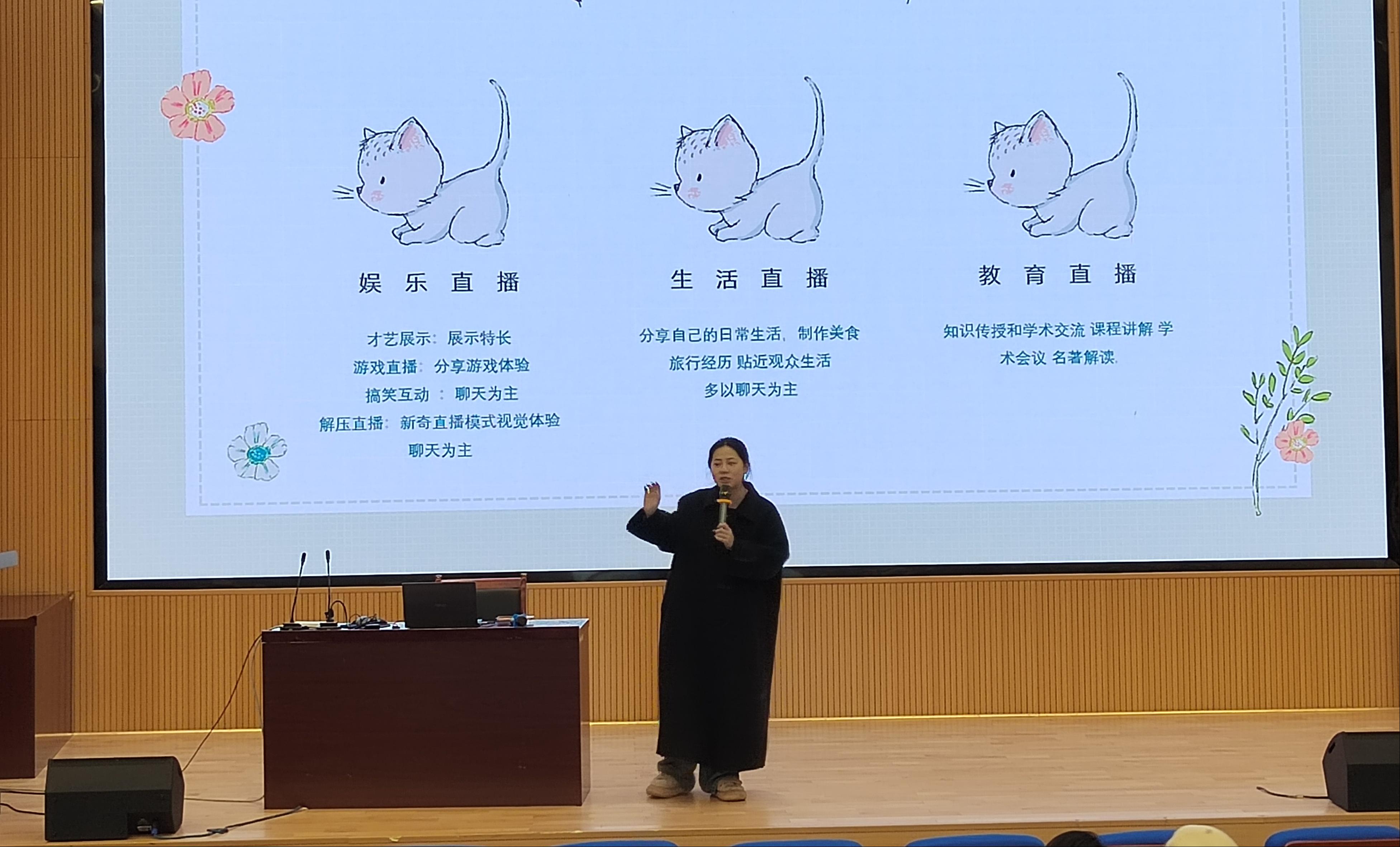 随后,公司工作人员围绕直播行业展开专题讲解,内容涵盖直播主流形式、行业发展现状与未来前景、直播岗位核心要求等关键内容。针对同学们普遍关注的职业方向问题,工作人员详细区分了娱乐主播与带货直播的核心差异,从能力要求、工作流程、发展路径等方面进行全面解读,帮助同学们厘清职业认知。讲解过程中,工作人员还与现场同学进行互动交流,耐心解答同学们关于行业入门、技能提升、职业规划等方面的疑问,为有意愿进入直播行业的同学提供了切实可行的学习与发展建议。