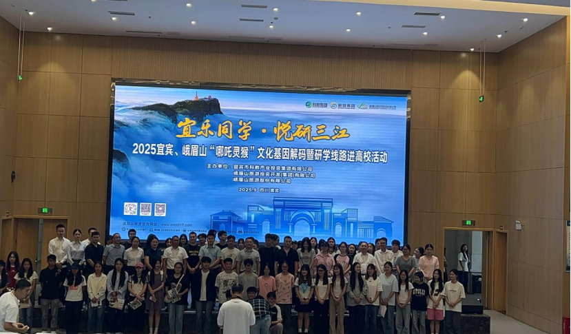 2025年9月24日下午18点整,宜宾职业技术学院人文与旅游学院园林12501班、旅游22102班、旅游12301班共120人参了加由宜宾市科教产业投资集团有限公司、峨眉山旅游投资开发(集团)有限公司、峨眉山旅游股份有限公司联合主办的2025宜宾、峨眉山“哪吒灵猴”文化基因解码暨研学线路进高校活动,活动以“宜乐同学·悦研三江”为主题,在四川省宜宾市翠屏区西南交通大学报告厅举行。主要面向高校学子推出多条深度融合宜宾市与峨眉山自然遗产和茶文化的研学路线。