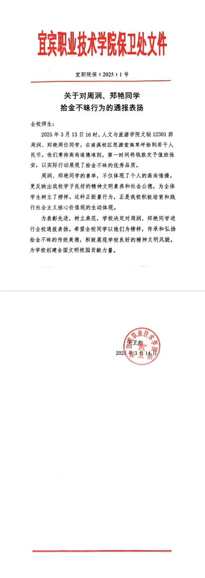 关于对周润、郑艳同学拾金不昧行为的通报表扬